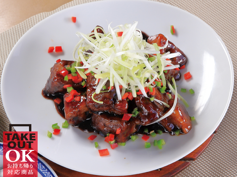 香ばしい味わいの柔らかな豚肉に、特製の黒酢ダレがたっぷり!黒い見た目とは裏腹に意外とさっぱりとお召し上がりいただけます。豚肉と野菜とのバランスのとれた1品です。爽やかな酸味と甘味でコク深いタレと肉の旨味をお楽しみください。